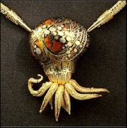 On his graduation in 1940, John Paul taught at the Cleveland School of Art for a year. His tour of duty with the Army at Fort Knox was given to illustrating manuals on tank tactics. Shortly after resuming his position at the school in 1946, he discovered a document by an archaeologist at the American Academy in Rome on the ancient technique of granulation. The paper was sufficient to guide Miller in the right direction – gold in the presence of copper lowers the melting point of both metals. By allowing copper to oxidise on the surface of gold granules, Miller discovered the ancient process making possible the fashioning of intricate designs.